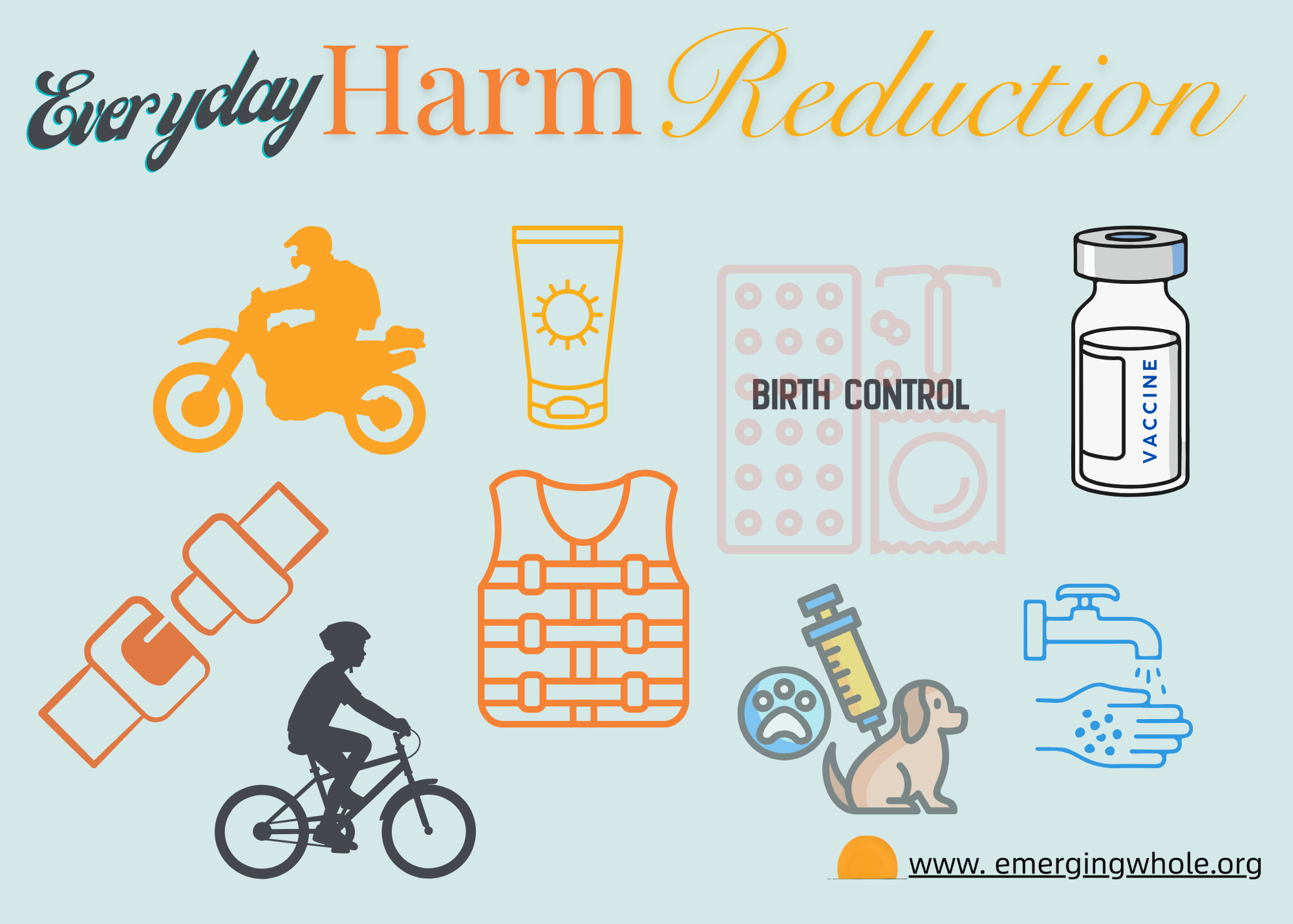 Harm reduction exists on a spectrum, from medical interventions to everyday choices. Some examples include: syringe access programs that prevent disease transmission, Naloxone distribution that saves lives during overdoses, Naltrexone for alcohol cravings, Suboxone for opioid withdrawal, and safer consumption spaces where people can use substances under medical supervision.