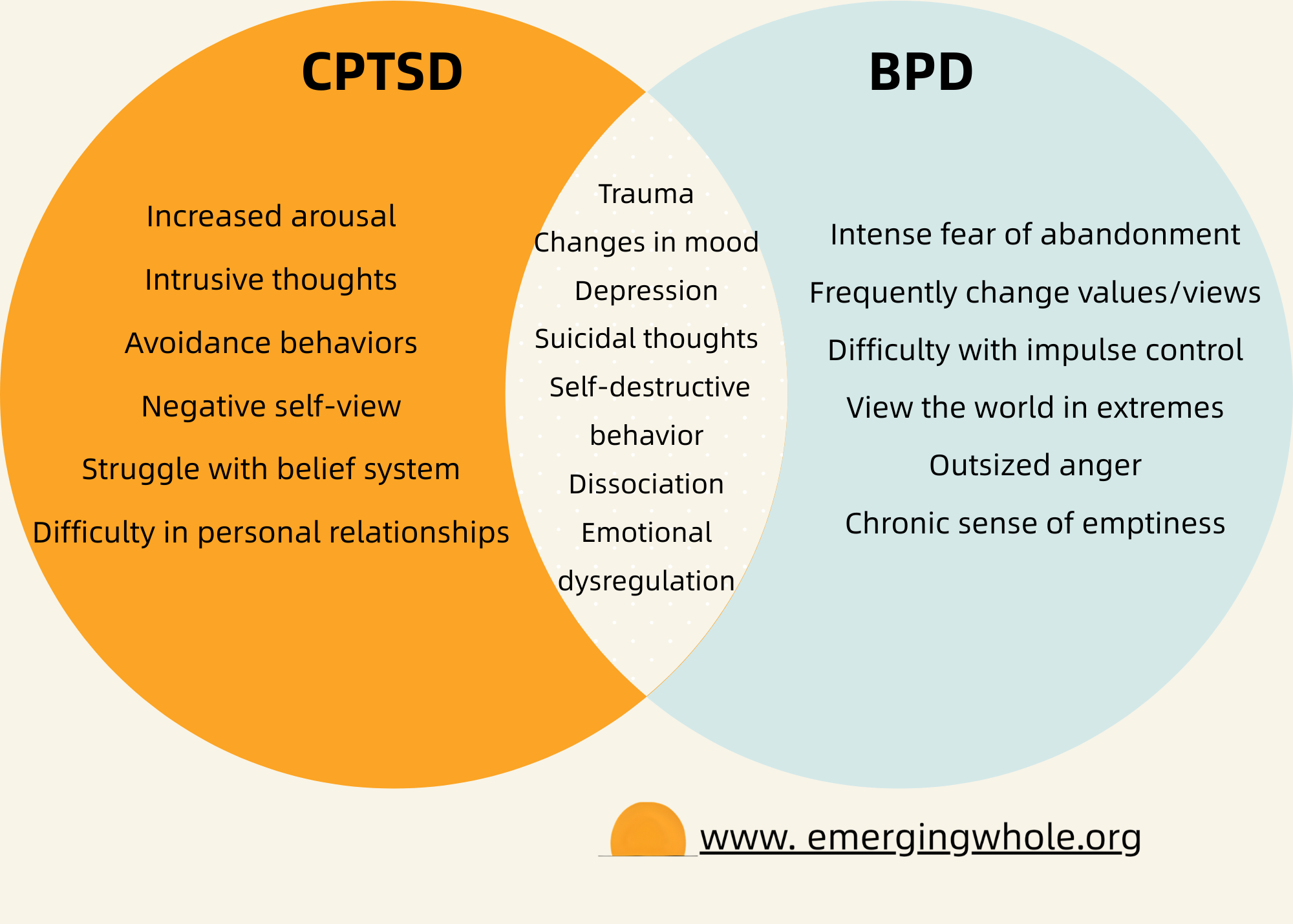 Self-identity: This is a major distinguisher. People with BPD struggle with knowing who they are at their core—their sense of self shifts constantly. People with CPTSD typically have a more stable sense of self, but it’s marked by shame, guilt, and feeling “permanently damaged.”