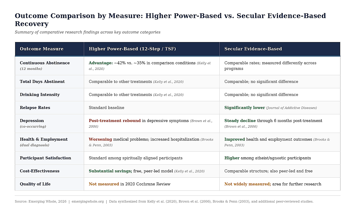 Across multiple studies and outcome measures, secular evidence-based programs demonstrate comparable abstinence rates, lower relapse rates, higher participant satisfaction among non-religious individuals, and superior outcomes for individuals with co-occurring mental health conditions. The body of evidence does not support characterizing these programs as lesser alternatives to 12-step models.