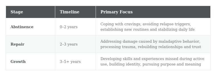 This framework illustrates that the work of recovery fundamentally changes over time. A person in the abstinence stage needs crisis-level coping tools. A person in the repair stage needs frameworks for processing pain and rebuilding trust. A person in the growth stage needs opportunities for purpose, skill-building, and identity development. No single intervention is adequate across all three stages—which is precisely why continuous learning matters.